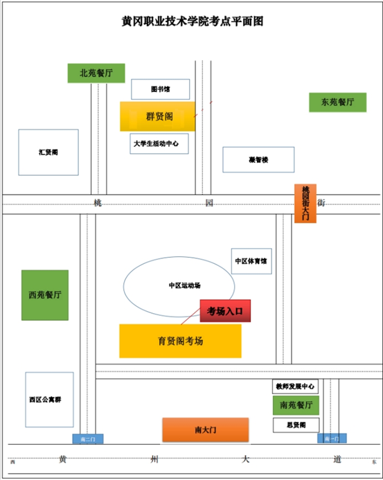 黄冈考区考点设在黄冈职业技术学院育贤阁。地址:湖北省黄冈市黄州区桃园街109号(如下图)。