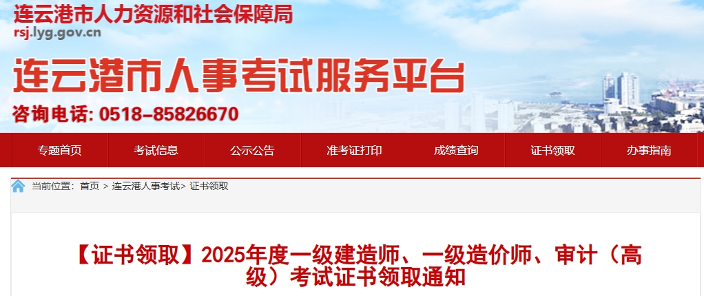 1月27日,连云港市人事考试服务平台发布《2025年度一级建造师、一级造价师、审计(高级)考试证书领取通知》,明确江苏连云港2025年一级建造师资格证书已经开始发放,请考生于2026年2月13日前申请邮寄或现场领取。