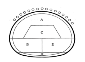 注:A-环形导坑开挖;B-下台阶左侧开挖;C-上部核心土开挖;D-仰拱开挖;E-下台阶右侧开挖