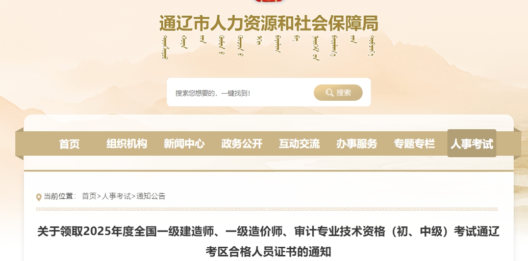 关于领取2025年度全国一级建造师、一级造价师、审计专业技术资格(初、中级)考试通辽考区合格人员证书的通知