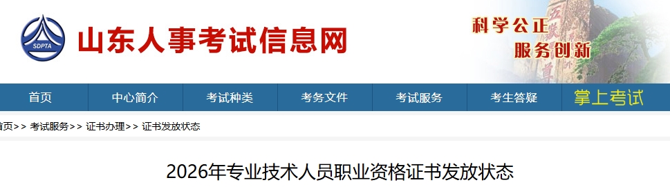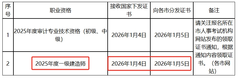1月7日,山东人事考试信息网发布《2026年专业技术人员职业资格证书发放状态》,明确2025年度一级建造师证书于1月4日接受国家下发证书,1月5日向各市分发证书,各位考生关注报名所在市人事考试机构通知。