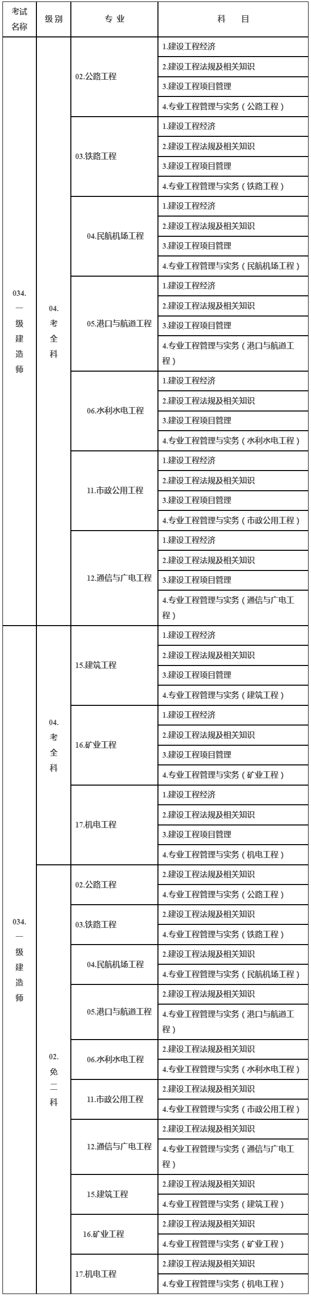 一级建造师职业资格考试代码及名称表