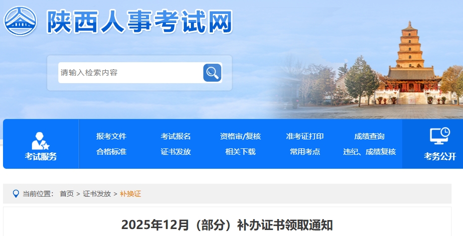 1月23日,陕西人事考试网发布《2025年12月(部分)补办证书领取通知》,明确陕西2025年一级建造师12月(部分)补办资格证书现开始领取,邮寄领取时间安排是2026年1月23日起,窗口领取时间是2026年1月27日-2026年2月12日和2026年2月24日-2026年3月5日。