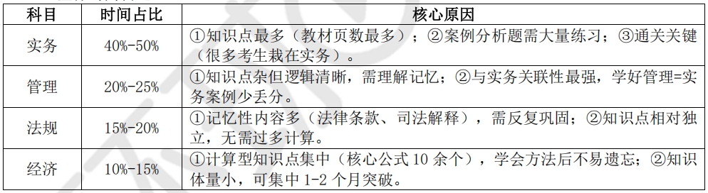 【强化阶段】:实务占比提升至 50%,公共课各占 15%-20%(实务开始案例训练,公共课通过真题巩固考点)。