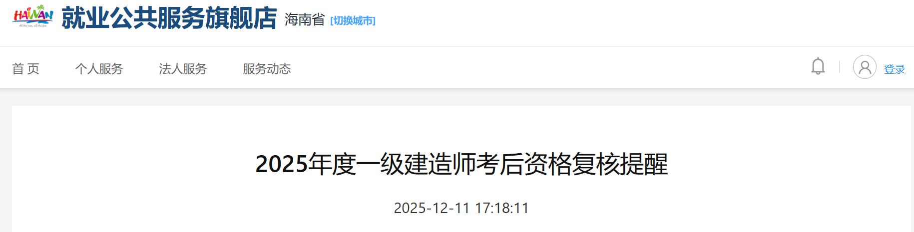 2025年海南一级建造师考后资格审核通知已发布,将对系统随机抽取的考生进行线上复核。考生须于12月17日12:00前将学历证明、报名表等材料发送至指定邮箱。逾期或审核不通过者,成绩将作无效处理。复核结果将于12月26日前公示。