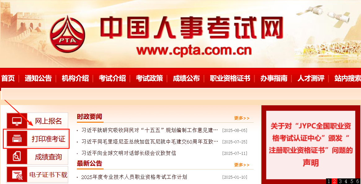 第一步:进入中国人事考试网,点击左侧“打印准考证”按钮。