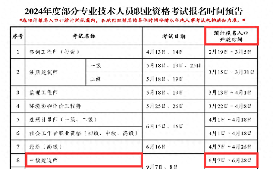 中国人事考试网公布了一级建造师的预计报名时间,6月7号到6月28号。