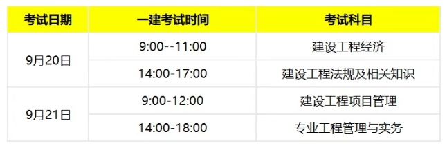 一级建造师考试为全国统考,原则上每年举行一次考试。2025年一级建造师考试时间确定为9月20日、21日,一建各科考试安排如下: