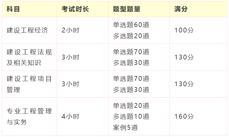 一级建造师考试公共科目为《建设工程经济》、《建设工程项目管理》、《建设工程法规及相关知识》,试题的题型分为单项选择题和多项选择题;专业科目为《专业工程管理与实务》,试题的题型分为单项选择题、多项选择题、案例分析题。