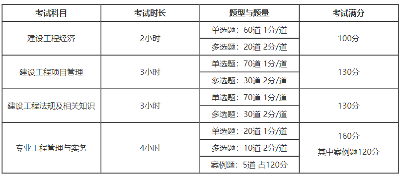 《建设工程经济》考试时间为2小时,《建设工程项目管理》考试时间为3小时,《建设工程法规及相关知识》考试时间为3小时,《专业工程管理与实务》考试时间为4小时。