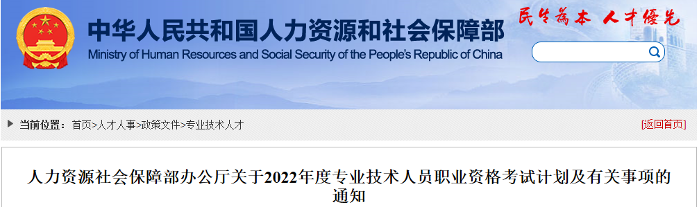 人力资源社会保障部办公厅关于2022年度专业技术人员职业资格考试计划及有关事项的通知