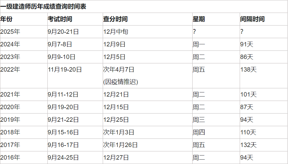 规律:自2023年起,一建考试出分效率显著提升,阅卷结束到成绩发布的间隔稳定在9个工作日左右。