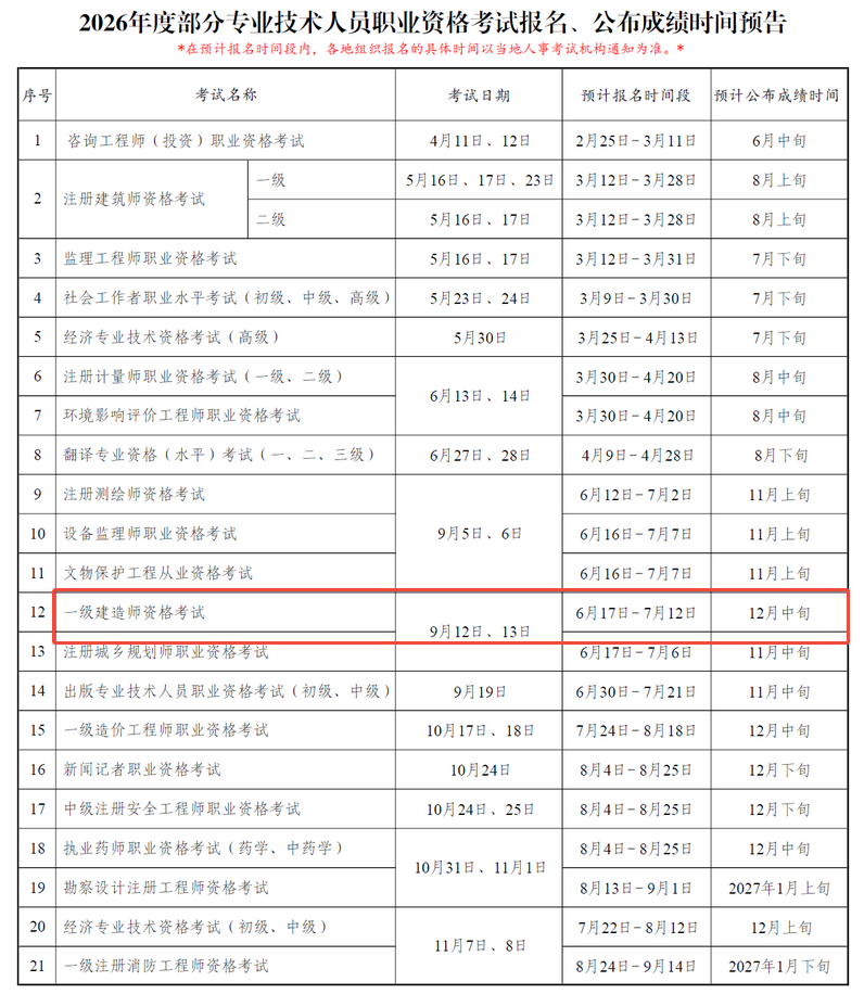2月28日,中国人事考试网正式发布《2026年度专业技术人员职业资格考试重要提示》,确定了2026年一级建造师考试报名时间预计为6月17日-7月12日。在预计报名入口开放时间范围内,各地组织报名的具体时间安排以当地人事考试机构通知为准。