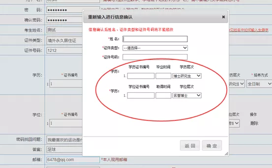 填写完毕确认无误后点击【提交】,出现信息确认,需要考生重新输入姓名、证件类型、证件类别、证件号码、学历、学位信息进行二次确认。如下图所示: