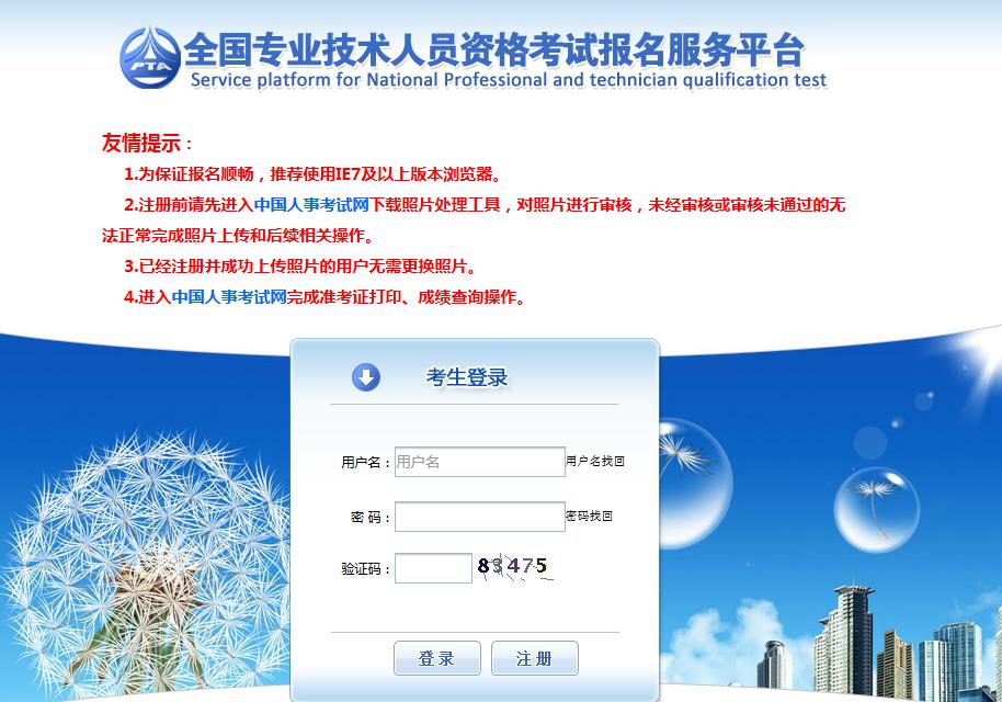 登录网上报名系统,选择所报的专业技术人员资格考试名称,进入网上报名界面。选择省(市)后,提示栏中将显示报考人员姓名、报考考试名称、报考地区、缴费方式和咨询电话。