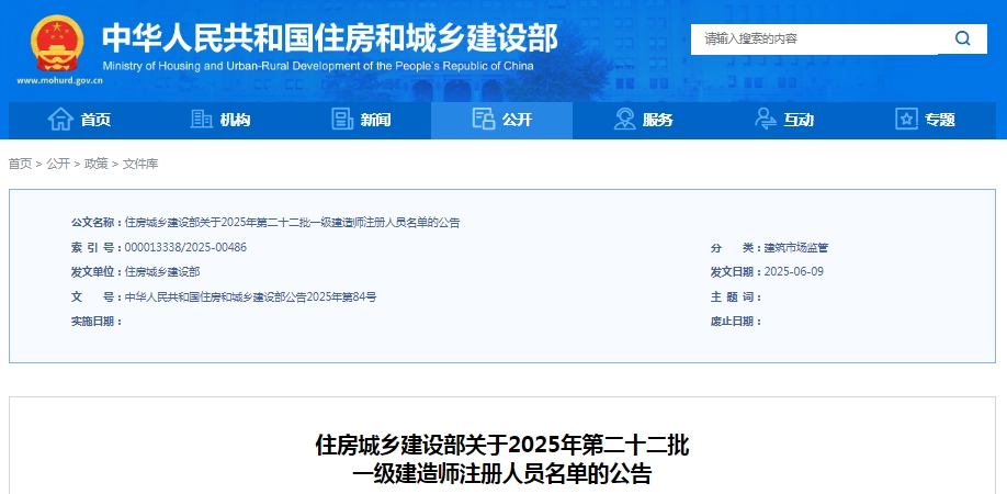 2025年第二十二批一级建造师注册人员名单公告已发布,本批次共19486人符合一级建造师注册条件,其中,初始注册共1095人,延续注册3297人,增项注册218人,重新注册14876人。