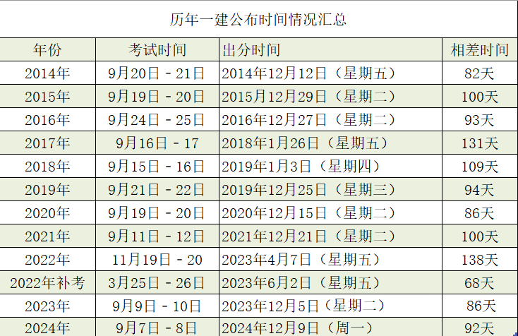 根据中国人事考试网在2025年9月发布的公告明确成绩公布时间为12月中旬。为了得出更精准的出分时间,我整理了2014~2024年一建考试成绩公布周期。