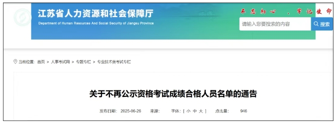 根据人社部人事考试中心有关工作要求,自2025年6月起,我省不再对全国专业技术人员资格考试合格人员名单进行公示。考生可登录中国人事考试网查询成绩和合格线,登录江苏省人力资源和社会保障厅网上办事大厅“个人办事-人才人事-江苏省人事考试报名-专技类资格考试审查结果查询”查看本人资格审查结果。