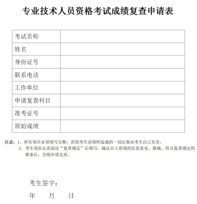 5、复查考试成绩申请表一般样式如下(各省复查考试成绩申请表可能有所不同,具体请以当地人事考试中心公布的复查考试成绩申请表为准):