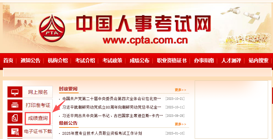 1、登录中国人事考试网http://www.cpta.com.cn/,点击【成绩查询】
