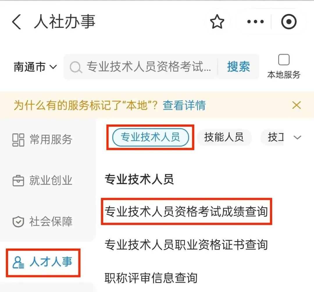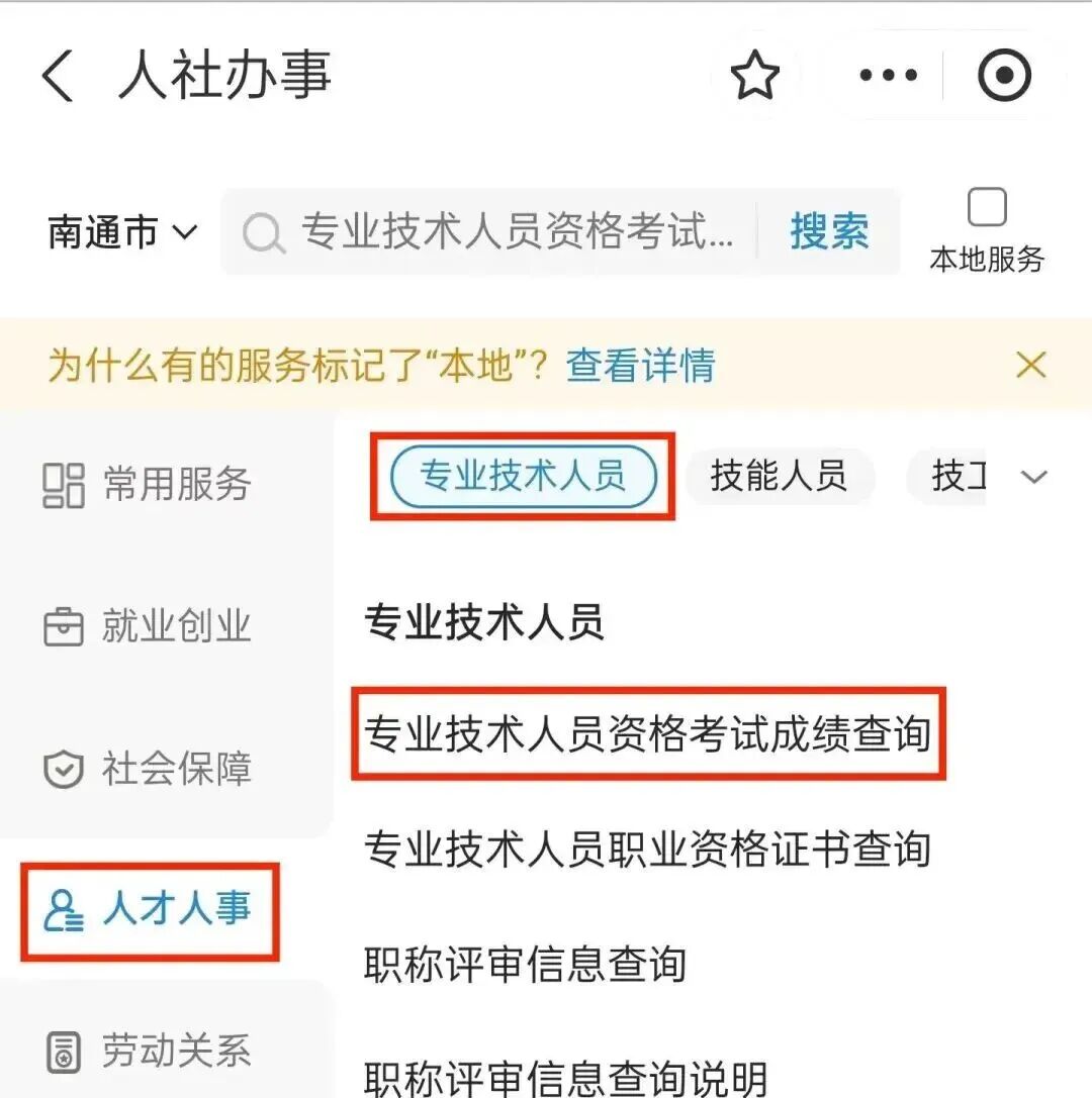 2、点击底部菜单【人社办事】,选择【人才人事】,点击【专业技术人员资格考试成绩查询】。