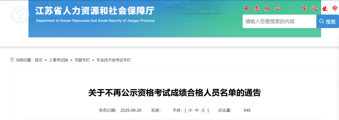 根据人社部人事考试中心有关工作要求,自2025年6月起,我省不再对全国专业技术人员资格考试合格人员名单进行公示。考生可登录中国人事考试网查询成绩和合格线,登录江苏省人力资源和社会保障厅网上办事大厅“个人办事-人才人事-江苏省人事考试报名-专技类资格考试审查结果查询”查看本人资格审查结果。