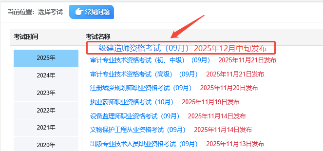 2025年一级建造师考试成绩查询入口官网为中国人事考试网,2025年度一级建造师执业资格考试成绩预计于2025年12月中旬公布。请考生到此网站“成绩查询”栏目进行查询。