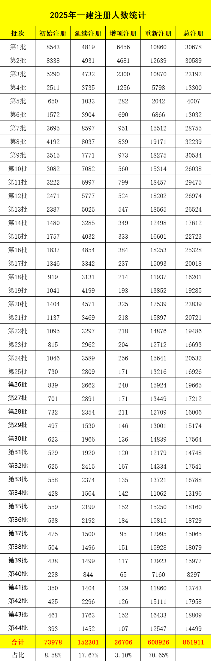 2025年第四十四批一级建造师注册人员名单公告已发布,本批次共14499人符合一级建造师注册条件,其中,初始注册共393人,延续注册1452人,增项注册107人,重新注册12547人。具体公告如下:
