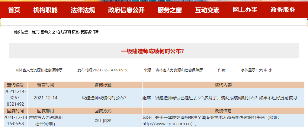 吉林省人力资源和社会保障厅网上回复:您好!关于一建成绩请您关注全国专业技术人员资格考试服务平台(网址:http://www.cpta.com.cn)。