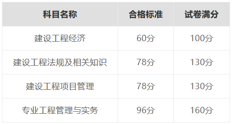一建考试各科目合格标准一般为试卷满分的60%。即:《建设工程经济》60分及格,《建设工程法规及相关知识》、《建设工程项目管理》78分及格,《专业工程管理与实务》96分及格。具体如下表所示: