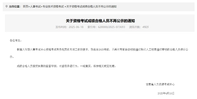 甘肃人社厅:明确发布通知,一建合格人员名单不再进行公示。