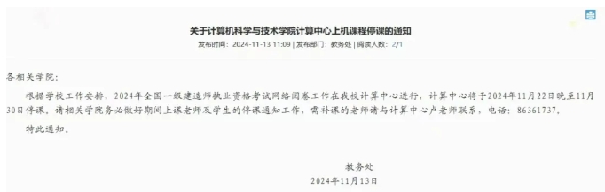 昨天,网上传了一份关于山东建筑大学发布的《关于计算机科学与技术学院计算中心上机课程停课的通知》,通知中提到:2024年全国一级建造师执业资格考试网络阅卷工作在我校计算中心进行,计算中心将于2024年11月22日晚至11月30日停课。