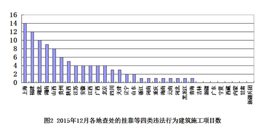 从查处的转包、挂靠等四类违法行为看,上海、福建、湖北、湖南、山西5省(直辖市)查处项目较多,分别为14个、12个、10个、9个、8个(见图2)。