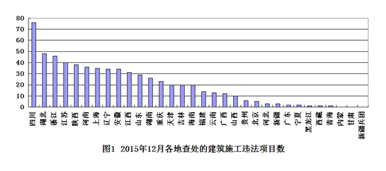 从各地查处的违法工程项目数量看,四川、湖北、浙江、江苏、陕西5省查处力度较大,分别查处项目76个、48个、46个、40个、38个(见图1)。