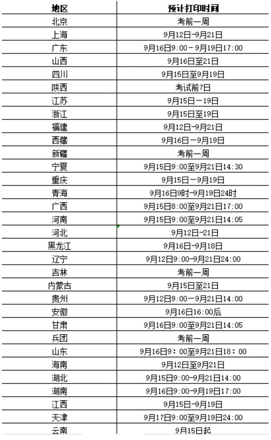 下面是从网上给大家汇总的准考证打印时间,具体的大家以当地官方考试机构的通知为准哦,不过大部分时间也都在9月12日—9月20日这段时间。
