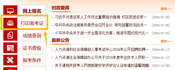 第一步:进入中国人事考试网,点击左侧“打印准考证”按钮。
