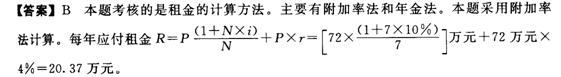 【答案】D本题考核的是租金的计算。采用附加率法计算是每年的租金=50×[(1+5×8%)/5]万元十50万元×4%=16.0万元。