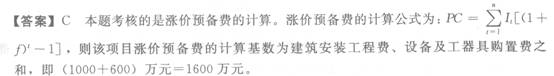 【答案】D本题考核的是涨价预备费的计算。涨价预备费是指建设工程项目在建设期内由于价格等变化引起投资增加,需要事先预留的费用。涨价预备费以建筑安装工程费、设备及工器具购置费之和为计算基数。该项目的涨价预备费的计算基数=(600+1200)万元=1800万元。