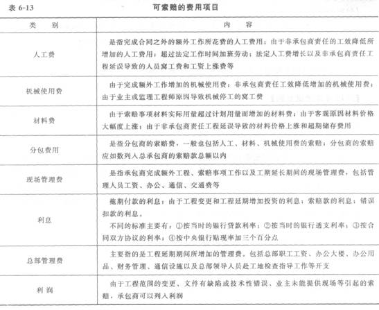 可索赔的费用项目见表6—13。