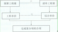 综合单价时,需要将增量费用分摊,进行组价,即由预算工程量乘以企业定额基价得出的合价应与清单工程量乘以综合单价得出的合价相等,两者的关系如图1Z103073-2所示。