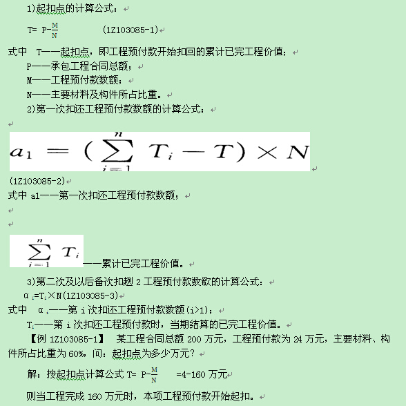 (2)从未完施工工程尚需的主要材料及构件的价值相当于工程预付款数额时起扣,从每次中间结算工程价款中,按材料及构件比重抵扣工程预付款,至竣工之前全部扣清。其基本计算公式如下: