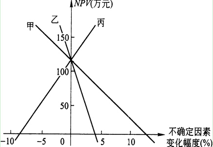 22.现对某技术方案进行单因素敏感性分析,选择净现值作为分析对象,如下图所示,甲、乙、丙三个不确定因素按敏感性由大到小的J顷序排列为( )。