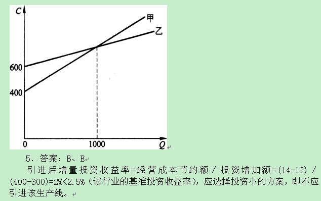 采用甲生产线,总成本为C甲=400+800×0.6=880万元;采用乙生产线,总成本为C乙=500+800×0.4=820万元;C乙 二、多项选择题 1.A、B、C; 2.C、E; 3.A、B、D、E; 4.A、D; *5.B、E 【解析】 4.答案:A、D 设产量为Q,则引进甲、乙生产线的总成本分别为:C甲=400+0.6Q;C乙=600+0.4Q, 在直角坐标系中画出两条总成本线,见下图: 令C甲=C乙,解出Q。= 1000万件 从图中可以看出,当产量为低于1000万件时,甲生产线成本低;当产量为高于1000万件时,乙生产线成本低。因此正确答案为A、D。