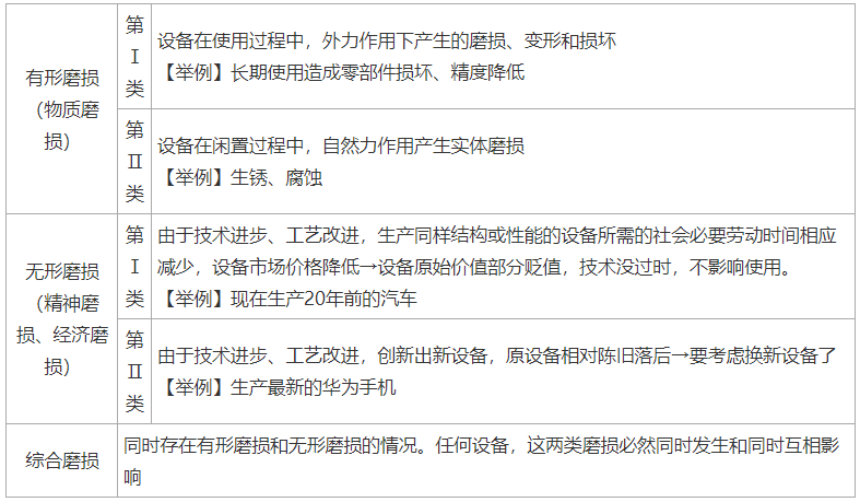 注意关键词,有形磨损分别是“使用”和“闲置”导致的。无形磨损是“技术进步”引起的,区别是:第Ⅰ类由于技术进步导致生产效率提高,故原有设备会贬值,但原设备还可以继续使用。第Ⅱ类由于技术进步导致出现新设备可以替代旧设备。