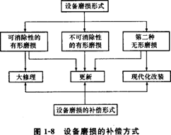本题考核的是第二种无形磨损的补偿方式。第二种无形磨损是由于科学技术的进步,不断创新出结构更先进、性能更完善、效率更高、耗费原材料和能源更少的新型设备,使原有设备相对陈旧落后,其经济效益相对降低而发生贬值。设备磨损的补偿如图1-8所示: