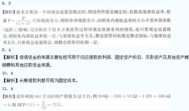 【解析】静态投资回收期愈短,风险愈小,技术方案抗风险能力强;盈亏平衡点越低,达到此点的盈亏平衡产销量就越少,抗风险能力也越强;一般应选择敏感程度小、承受风险能力强、可靠性大的技术方案。