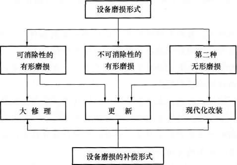 【解析】本题考查设备磨损补偿的相关概念。设备发生磨损后,需要进行补偿,以恢复设备的生产能力。由于设备遭受磨损的形式不同,补偿磨损的方式也不一样。补偿分局部补偿和完全补偿。设备有形磨损的局部补偿是修理,设备无形磨损的局部补偿是现代化改装。设备有形磨损和无形磨损的完全补偿是更新,见图。