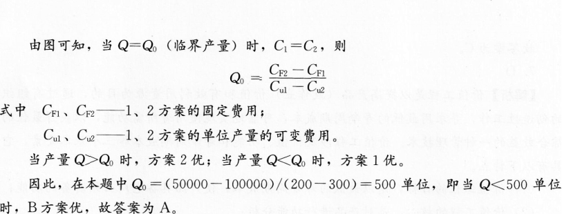 【解析】当方案的有用成果不相同时,一般可通过方案费用的比较来决定方案的使用范围,进而取舍方案。通常可用数学分析的方法和图解的方法来进行。