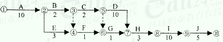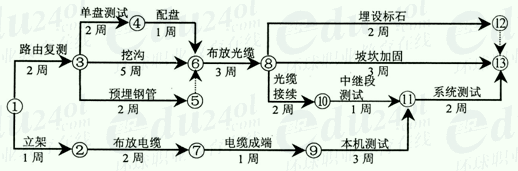 例4. 背景资料: 某省内传输网工程,包括线路和设备两部分。光缆沿线与原有光缆、铁路交越。建设单位和施工单位签定了承包合同,合同工期16周;交越过路手续和赔补由建设单位负责,钢管、水泥、沙石由施工单位采购。施工单位提交了初步的施工进度网络计划并得到了建设单位的批准,如下图所示(每周按7天计算):