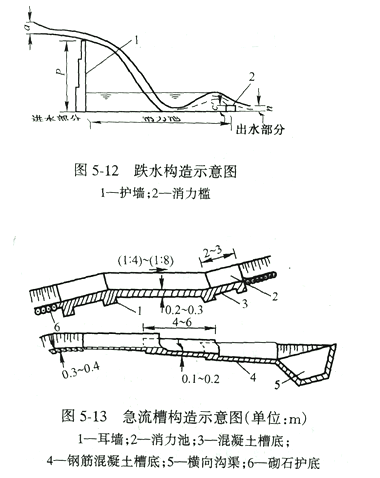 2.急流槽的纵坡不宜超过1:1.5,同时应与天然地面坡度相配合。当急流槽较长时,槽底可用几个纵坡,一般是上段较陡,向下逐渐放缓。